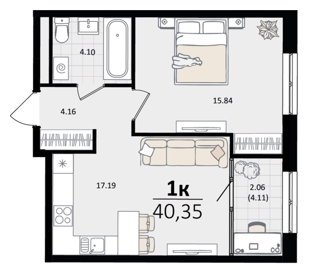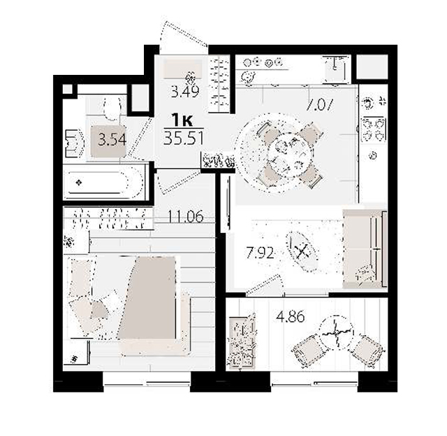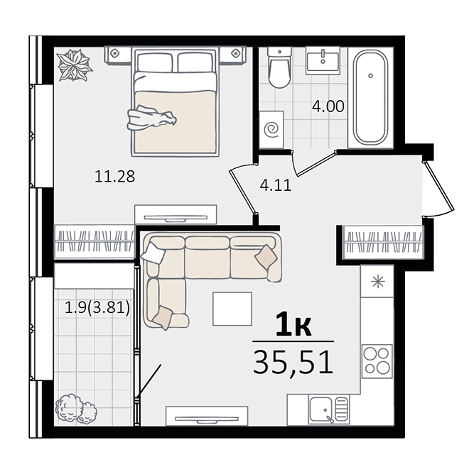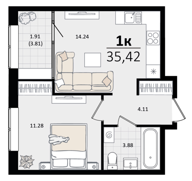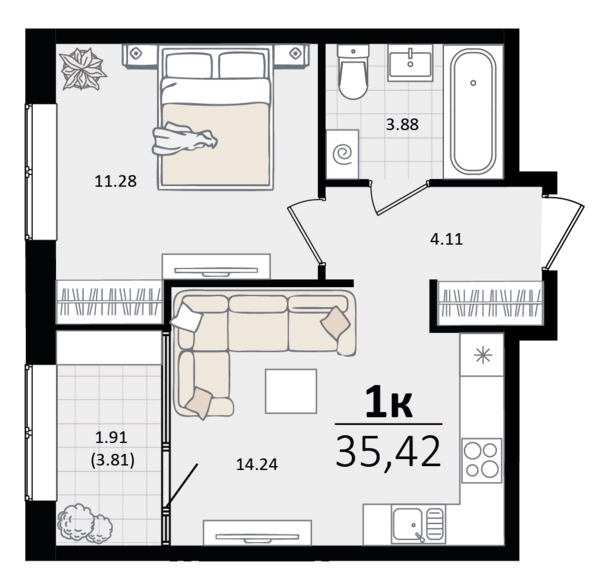 | 1 | 35.42 / 11.28 м² | от 10 881 024 руб. (307 200 руб./м²) | Планировка | |
