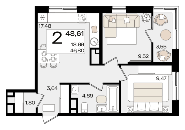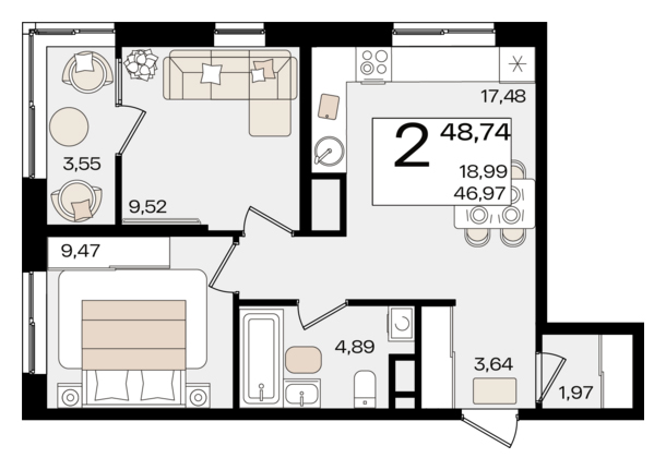 | 2 | 48.61 / 18.99 м² | от 14 558 695 руб. (299 500 руб./м²) | Планировка | |
