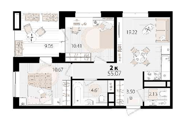| 2 | 54.85 / 21.08 м² | от 16 114 930 руб. (293 800 руб./м²) | Планировка | |