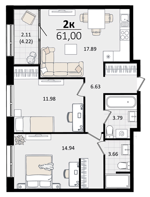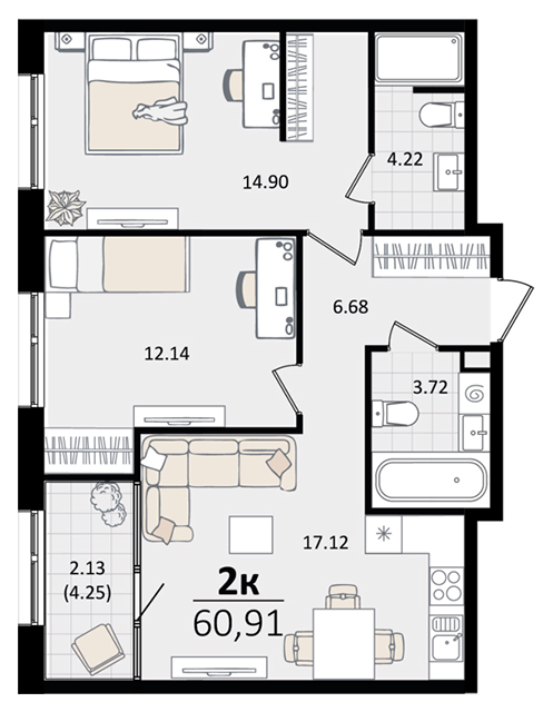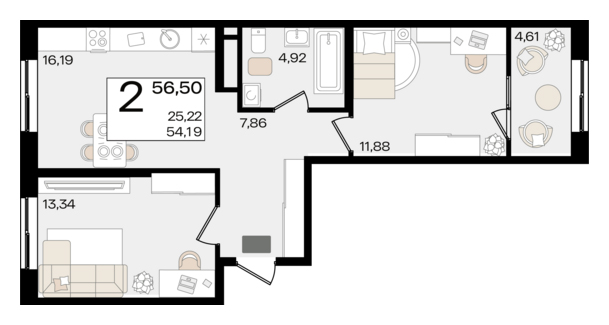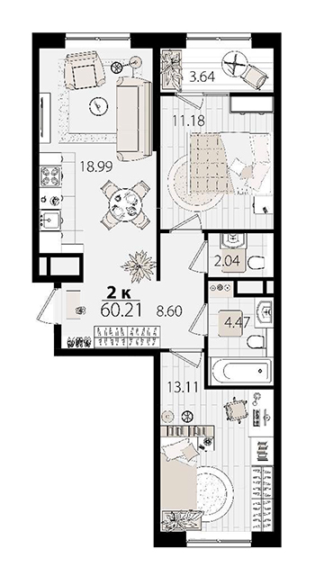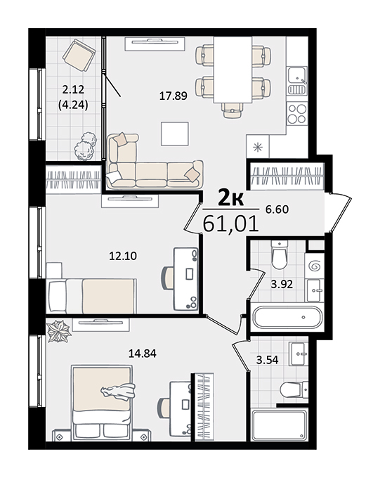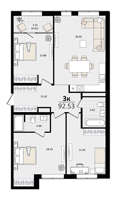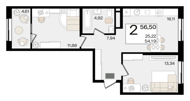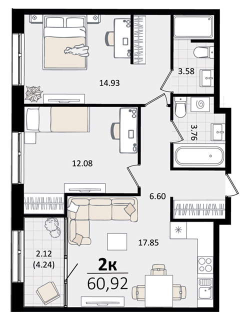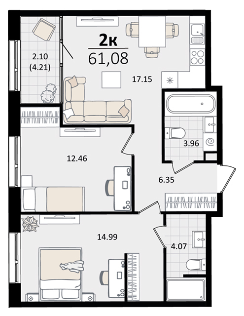 | 2 | 60.92 / 27.01 м² | от 16 229 088 руб. (266 400 руб./м²) | Планировка | |