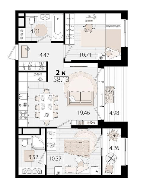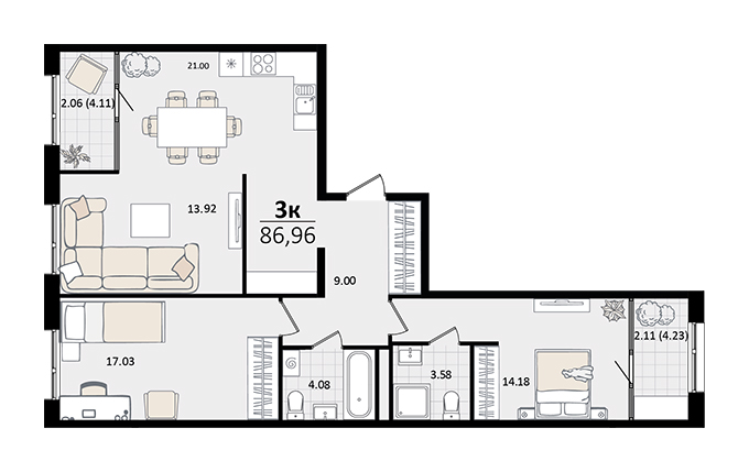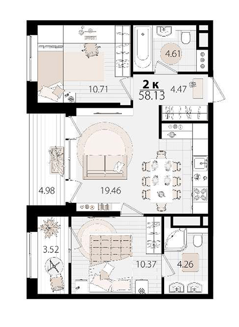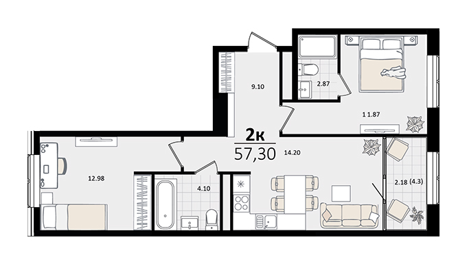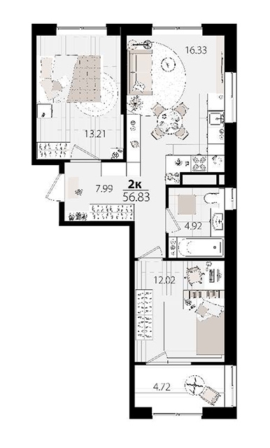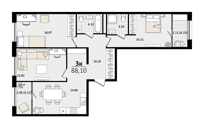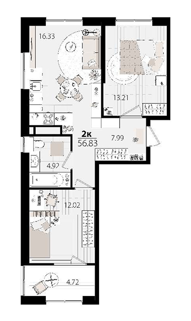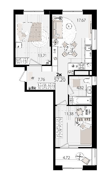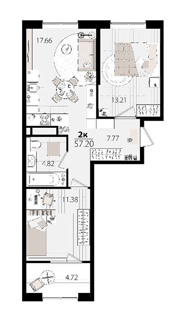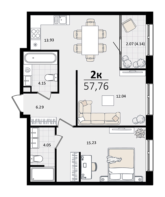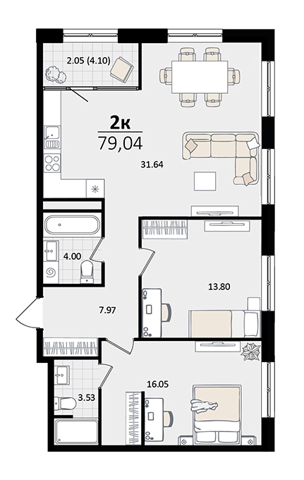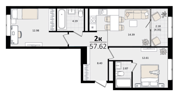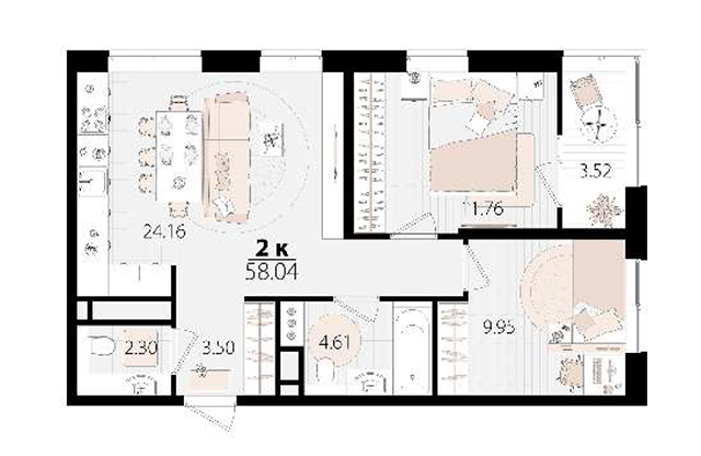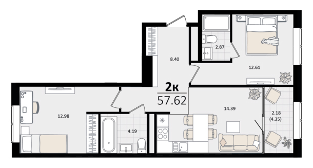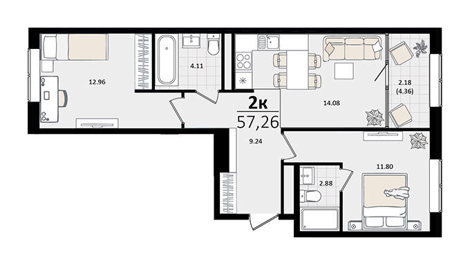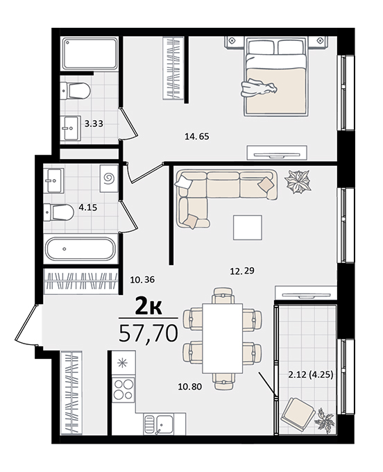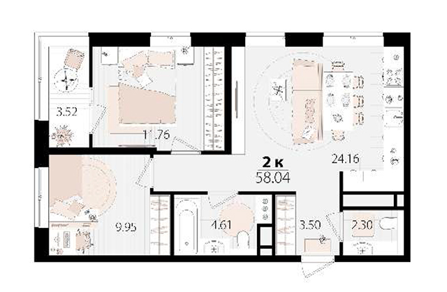 | 2 | 57.9 / 21.08 м² | от 16 953 120 руб. (292 800 руб./м²) | Планировка | |
