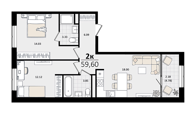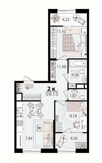 | 2 | 59.6 / 26.15 м² | от 18 601 160 руб. (312 100 руб./м²) | Планировка | |