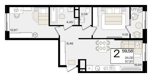 | 2 | 59.58 / 24.02 м² | от 17 033 922 руб. (285 900 руб./м²) | Планировка | |