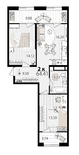 | 2 | 64.21 / 27.51 м² | от 17 721 960 руб. (276 000 руб./м²) | Планировка | |