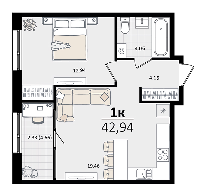 | 1 | 42.84 / 9.36 м² | от 12 732 048 руб. (297 200 руб./м²) | Планировка | |