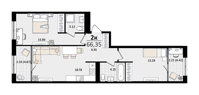 | 2 | 66.35 / 25.03 м² | от 18 697 430 руб. (281 800 руб./м²) | Планировка | |