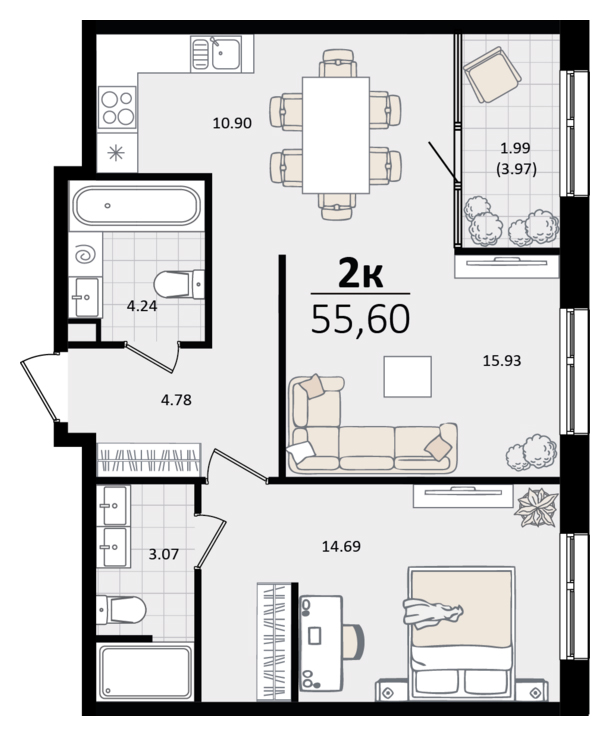 | 2 | 55.6 / 30.62 м² | от 15 151 000 руб. (272 500 руб./м²) | Планировка | |
