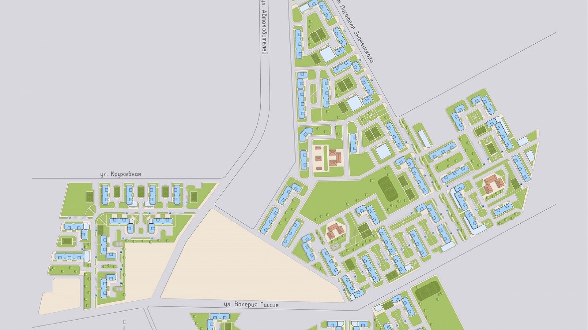 Застройщик планирует создать целый микрорайон, поэтому на территории предусмотрено строительство детских садиков, школ и гимназий, а также торгово-развлекательных центров.