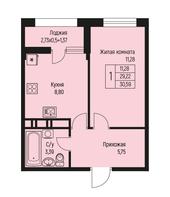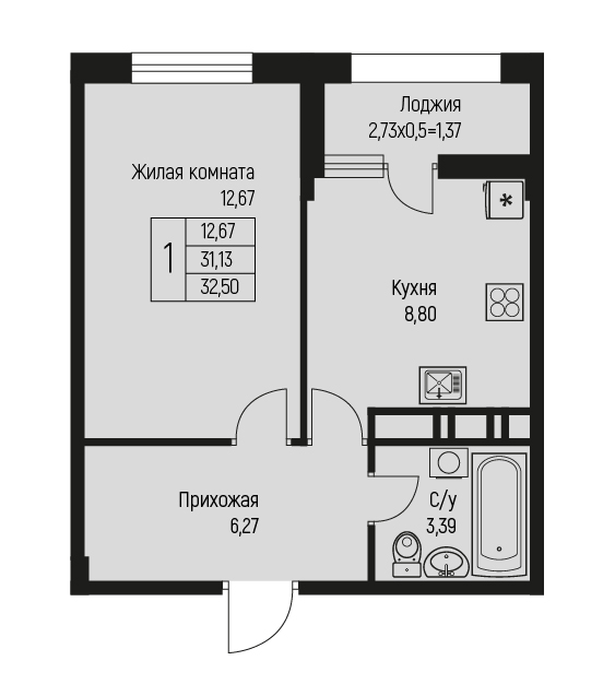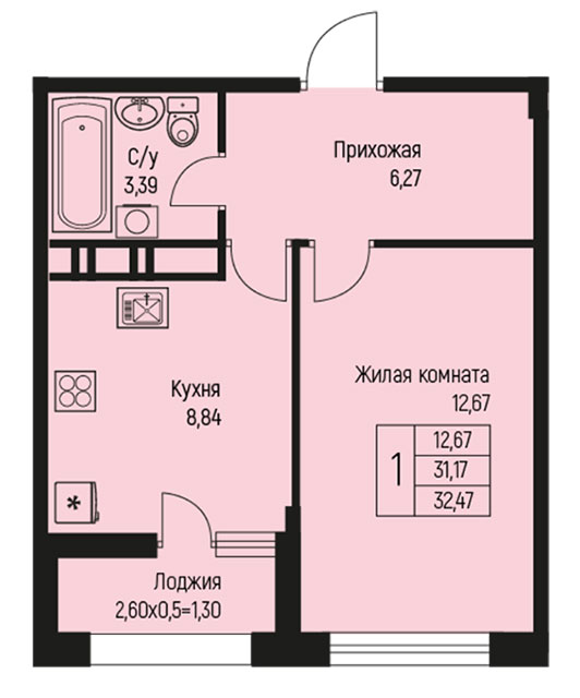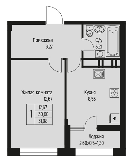 1 31.98 / 12.67 м² от 4 541 160 руб. (142 000 руб./м²) Планировка