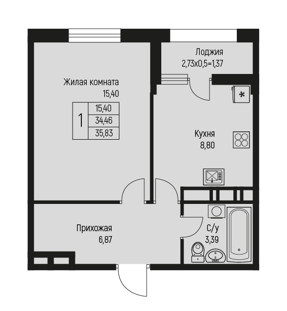1 35.83 / 15.4 м² от 5 016 200 руб. (140 000 руб./м²) Планировка