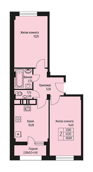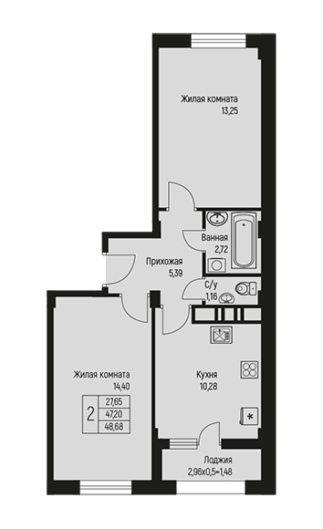 2 48.68 / 27.65 м² от 6 328 400 руб. (130 000 руб./м²) Планировка