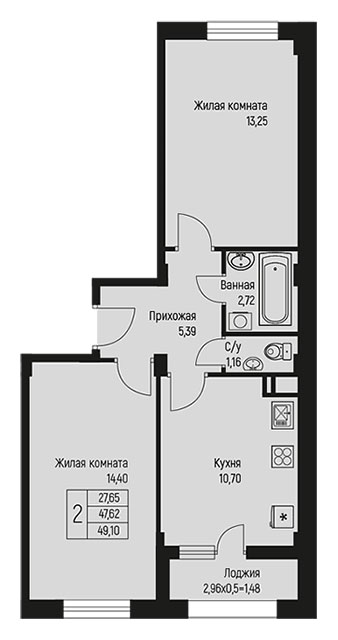 2 49.10 / 27.65 м² от 6 186 600 руб. (126 000 руб./м²) Планировка