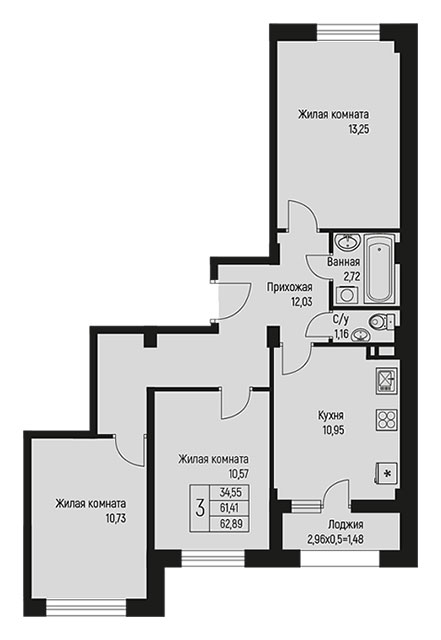 3 62.89 / 34.55 м² от 7 106 570 руб. (113 000 руб./м²) Планировка