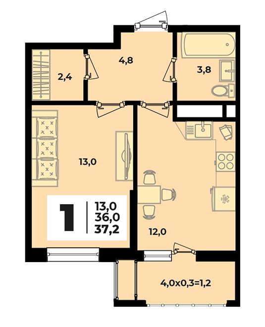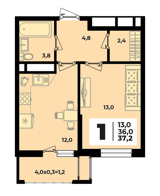 | 1 | 37.2 / 13 м² | от 5 704 400 руб. (153 344 руб./м²) | Планировка | |