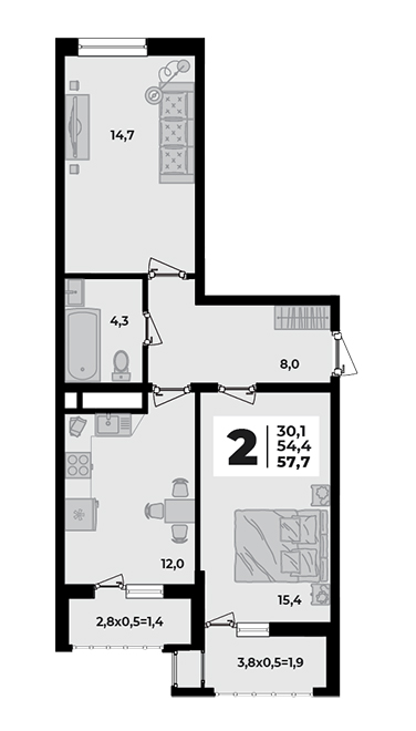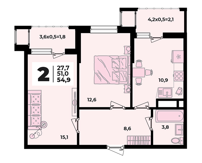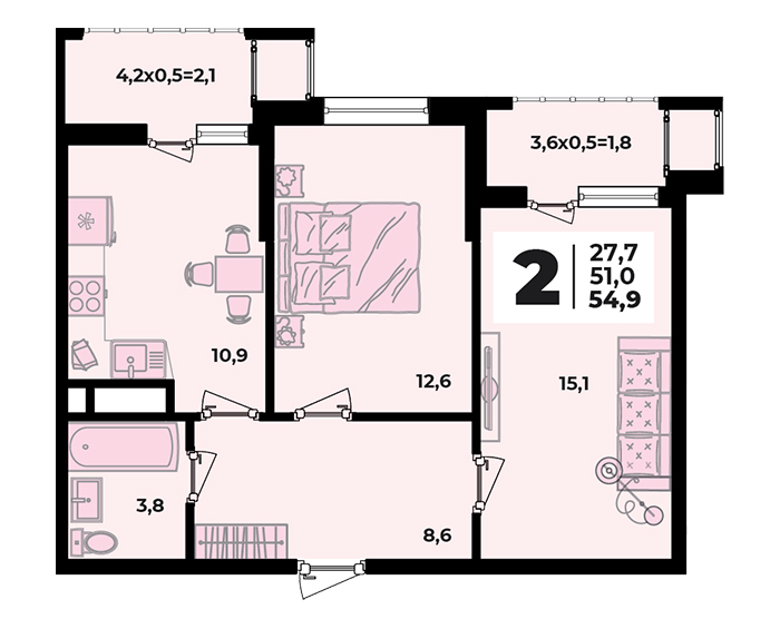 | 2 | 54.9 / 27.7 м² | от 8 120 300 руб. (147 911 руб./м²) | Планировка | |