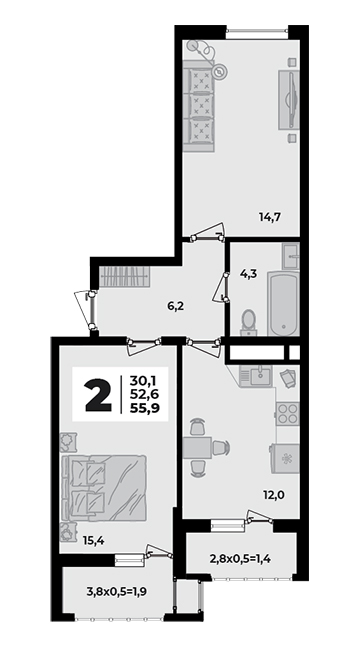 | 2 | 55.9 / 30.1 м² | от 8 490 900 руб. (151 894 руб./м²) | Планировка |