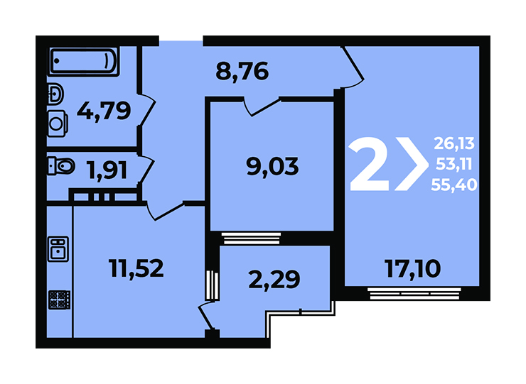 2 55.4 / 26.13 м² от 7 252 160 руб. (130 905 руб./м²) Планировка