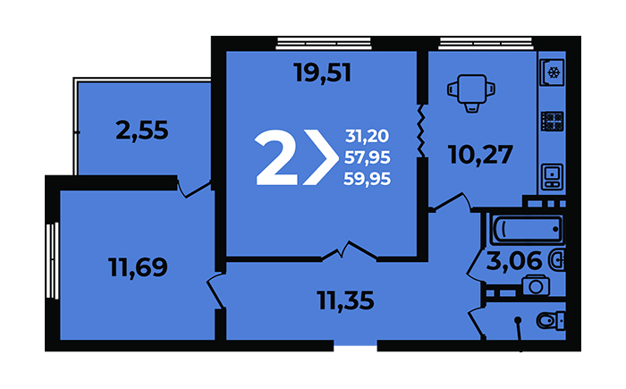 2 59.95 / 31.2 м² от 7 364 010 руб. (122 836 руб./м²) Планировка