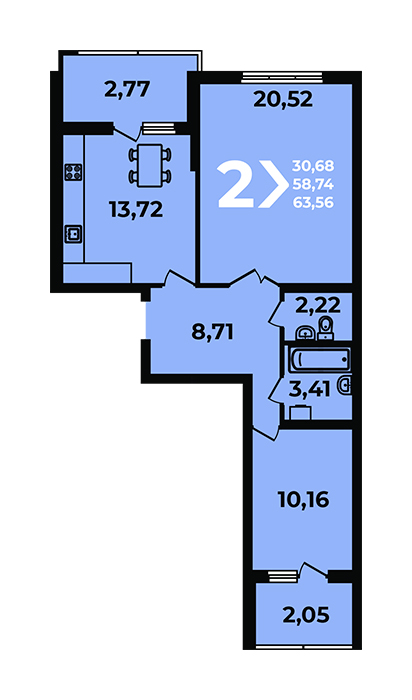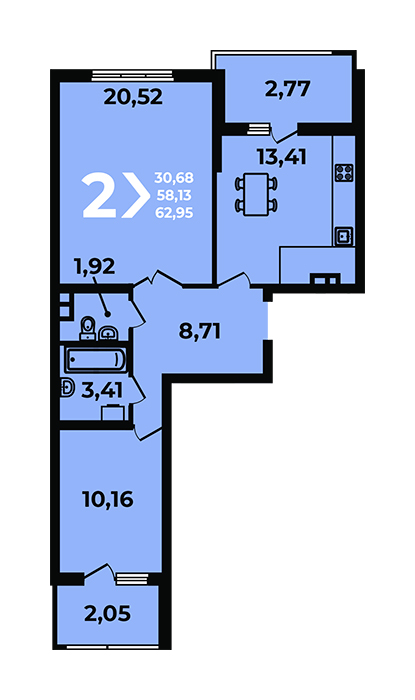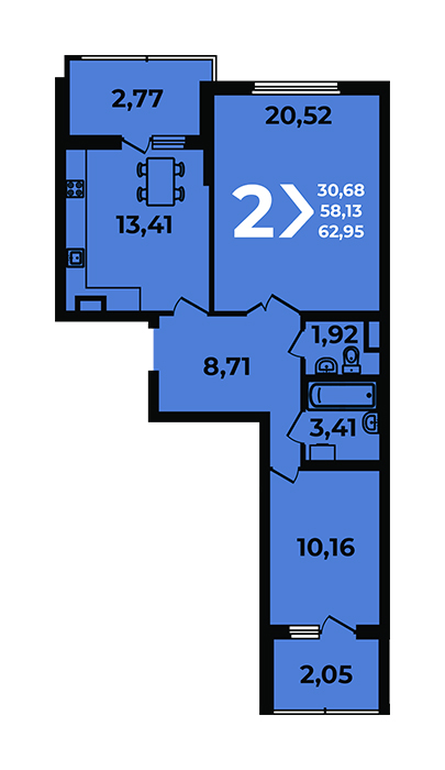 2 62.95 / 30.68 м² от 7 554 000 руб. (120 000 руб./м²) Планировка