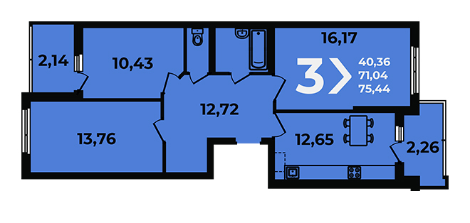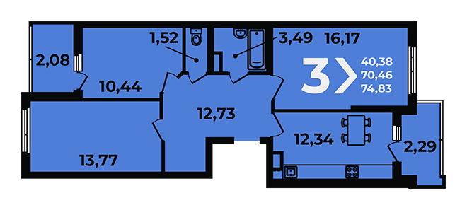 3 74.83 / 40.38 м² от 8 530 620 руб. (114 000 руб./м²) Планировка