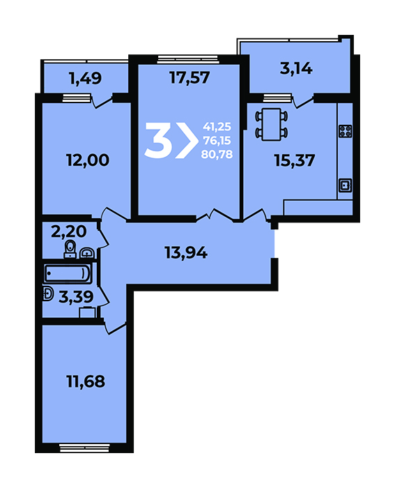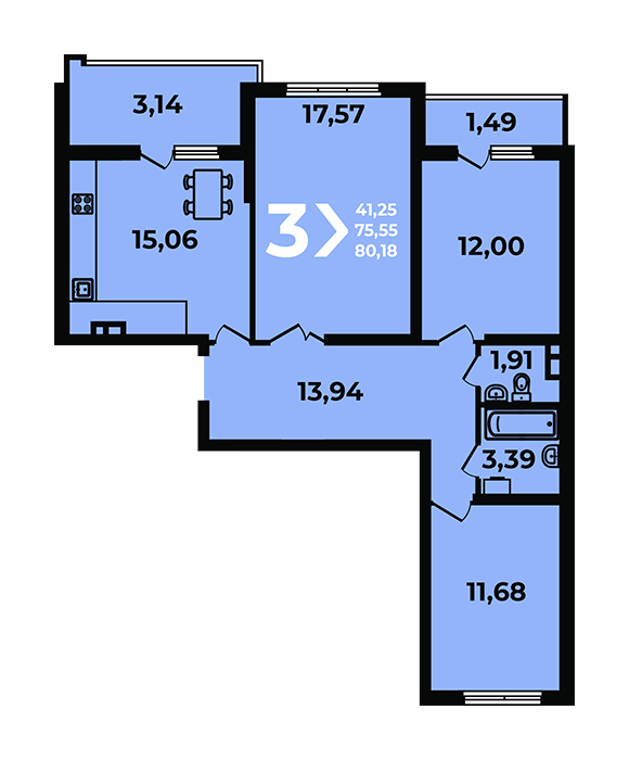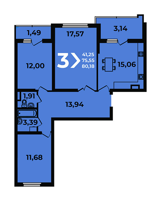 3 80.18 / 41.25 м² от 8 899 980 руб. (111 000 руб./м²) Планировка