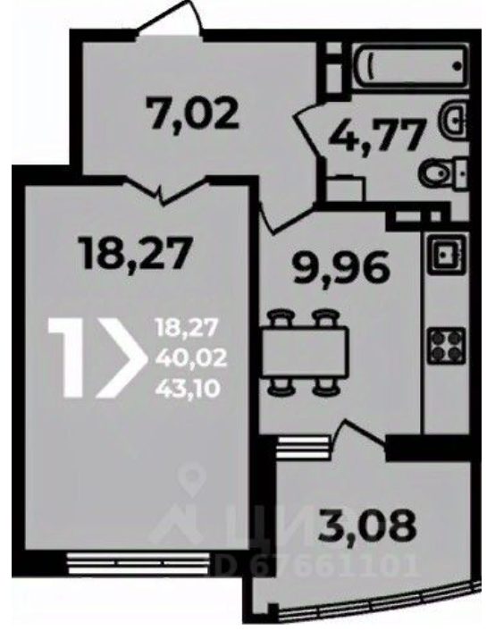 1 43.1 / 18.27 м² от 6 335 700 руб. (147 000 руб./м²) Планировка