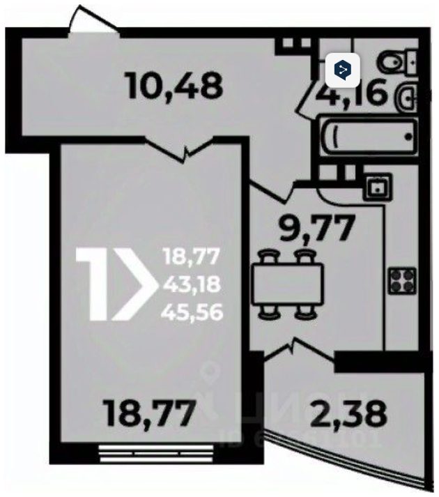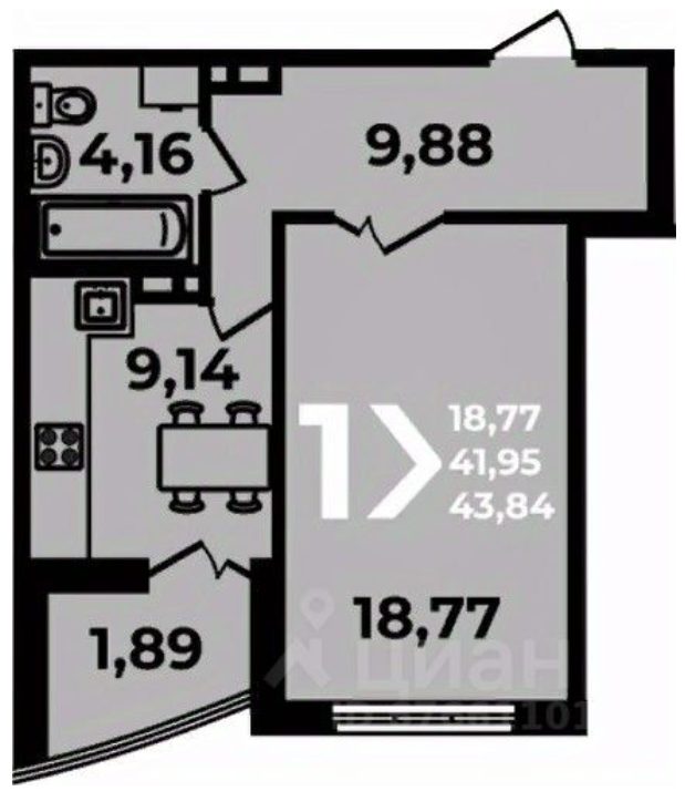 1 43.84 / 18.77 м² от 6 444 480 руб. (147 000 руб./м²) Планировка
