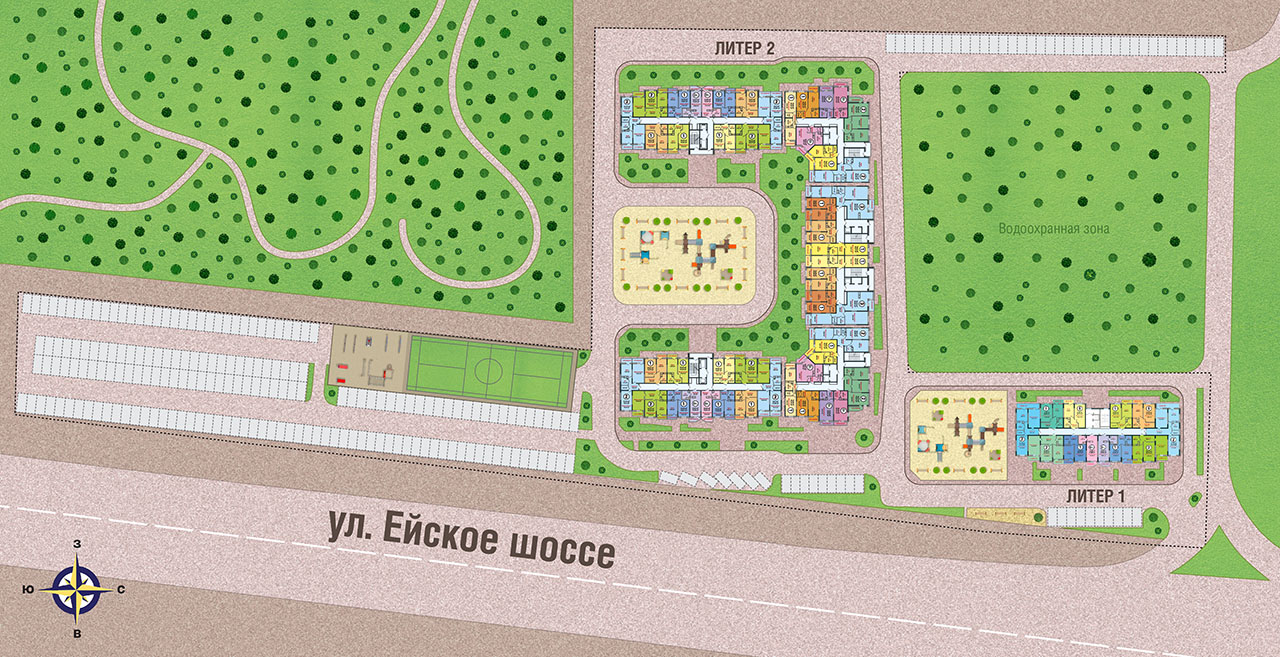 Первые этажи двух литеров предназначены для эксплуатации в коммерческих целях: магазины, сервисные службы, офисы. На придомовой территории размещены игровая и спортивная площадки, зона отдыха, большая открытая стоянка.