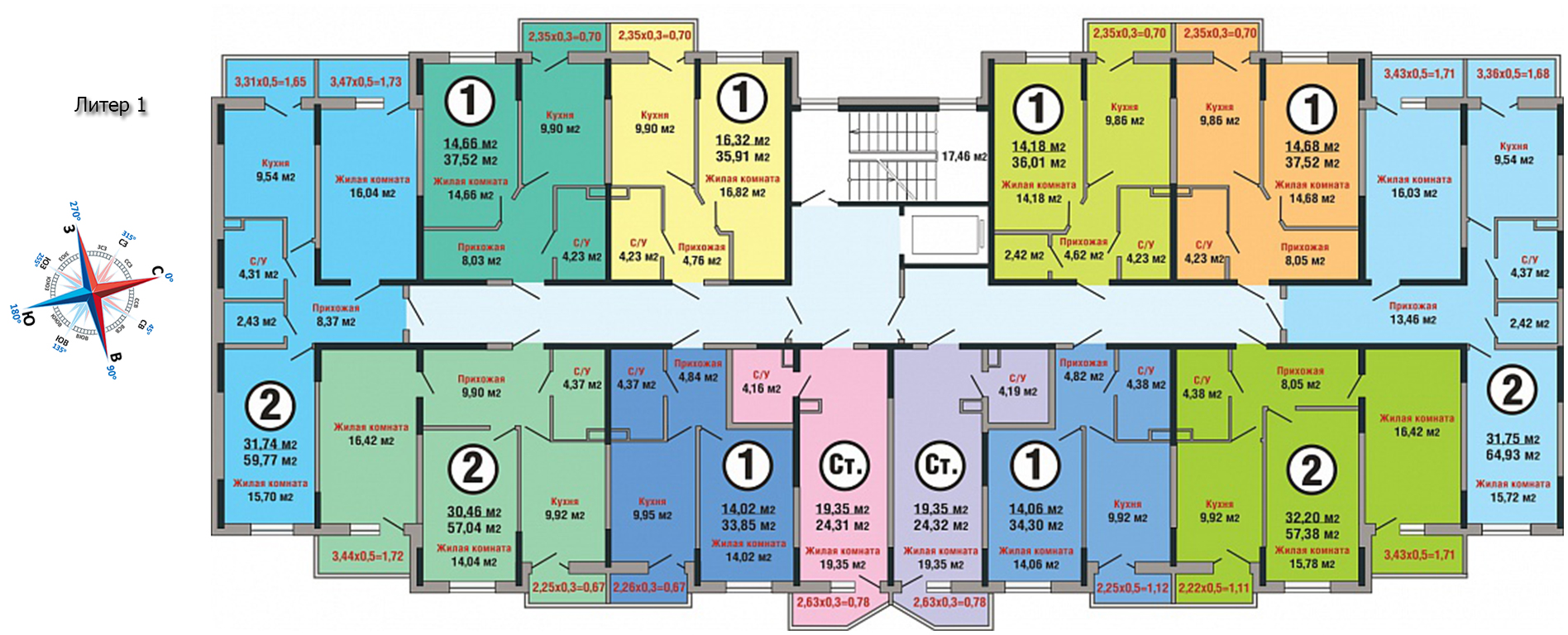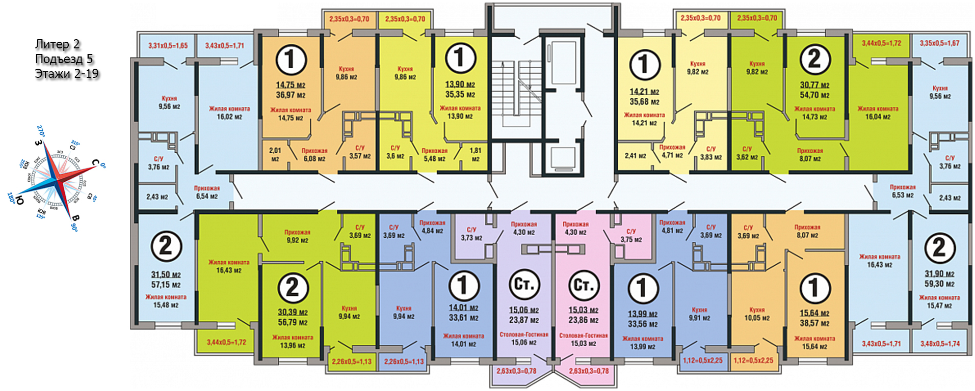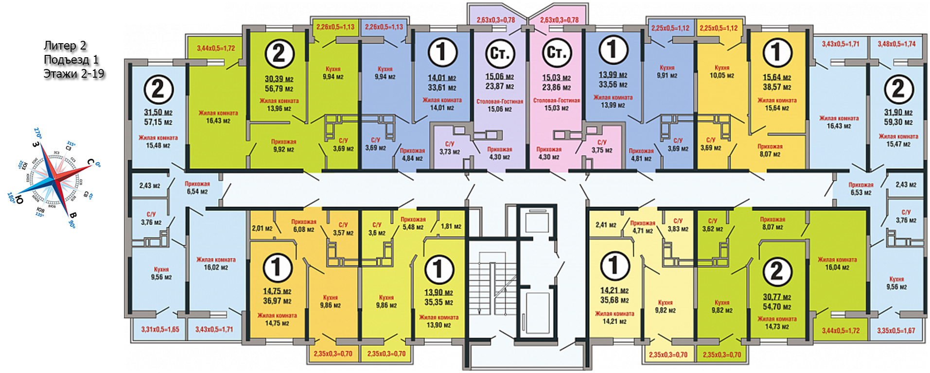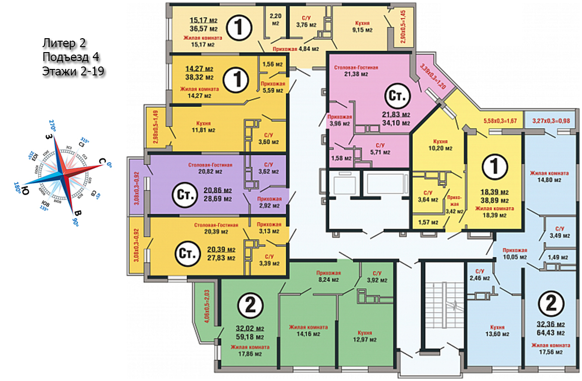 Застройщик запланировал квартиры наиболее популярных форматов: студии и 1-2-комнатные разных площадей. Во 2 литере имеется небольшое количество достаточно просторных 3-комнатных квартир. В каждом подъезде установлен скоростной лифт. Количество квартир на площадке от 4 до 12. Продаются покупателям они в трех вариантах: с ремонтом “под ключ”, с предчистовой отделкой или с полным ремонтом, выполненным по типовому проекту “эконом” или “комфорт”.