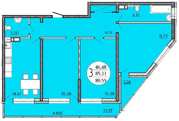 Квартира: 3-к / 89.55 м²
