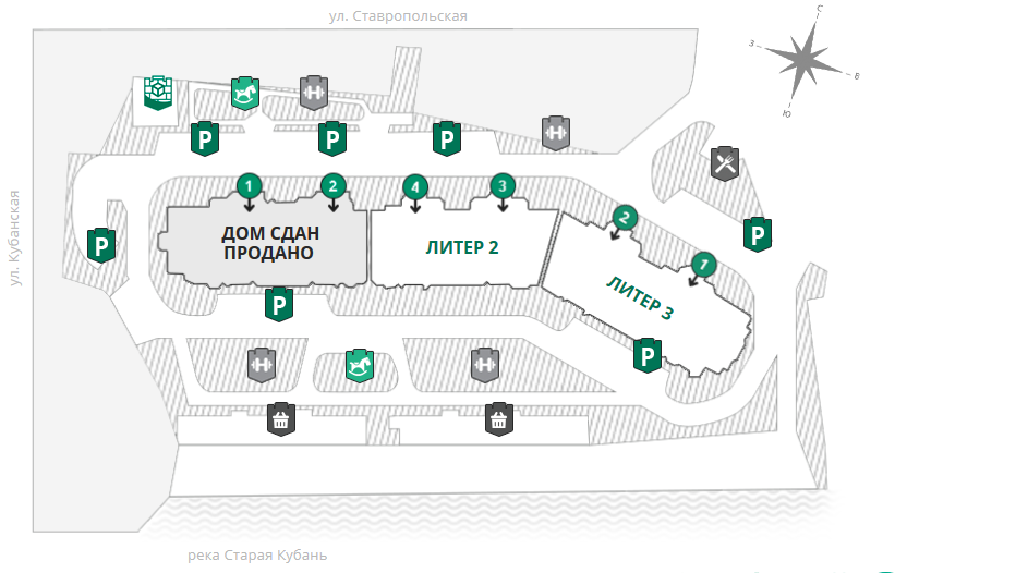 Придомовая территория небольшая, но она компенсируется подземной парковкой, а прогулочная зона – максимальной близостью к парку «Солнечный остров».