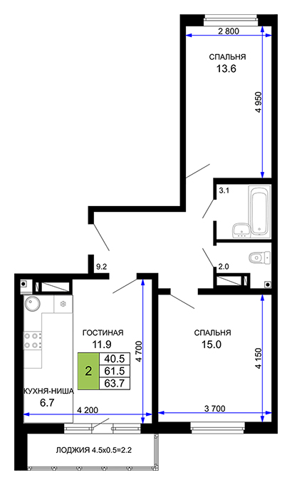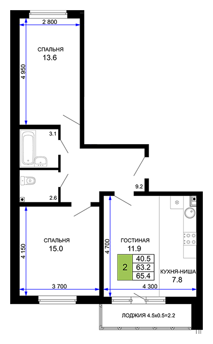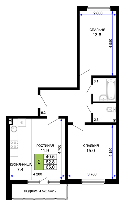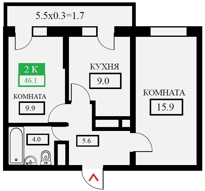 | 2 | 46.1 / 25.8 м² | 4 950 000 руб. | Планировка | Квартира от подрядчика, предчистовая, ипотека |