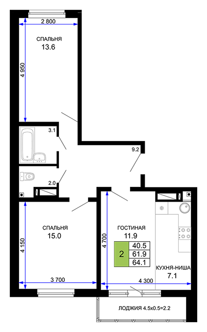 | 2 | 64.1 / 39.5 м² | от 8 653 500 руб. (135 000 руб./м²) | Планировка |