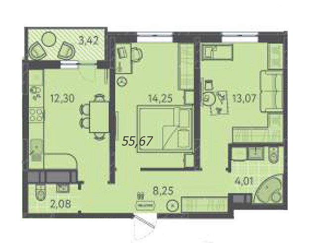 | 2 | 55.67 / 27.32 м² | от 7 793 800 руб. (140 000 руб./м²) | Планировка | |
