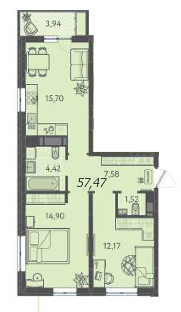 | 2 | 57.47 / 27.07 м² | от 6 896 400 руб. (120 000 руб./м²) | Планировка | |