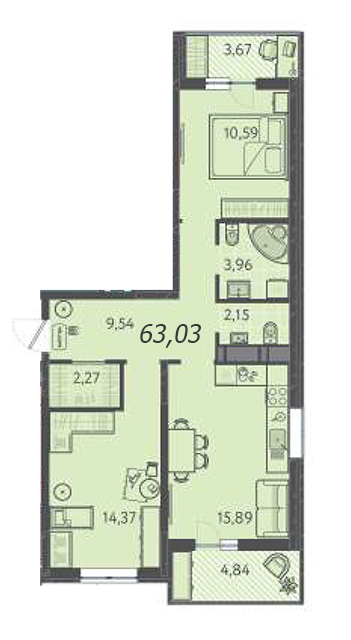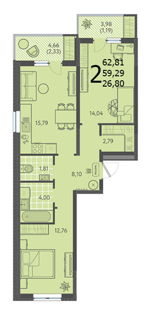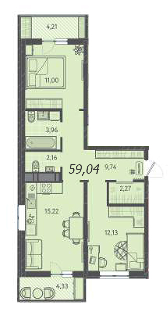 | 2 | 59.04 / 23.13 м² | от 7 143 840 руб. (121 000 руб./м²) | Планировка | |