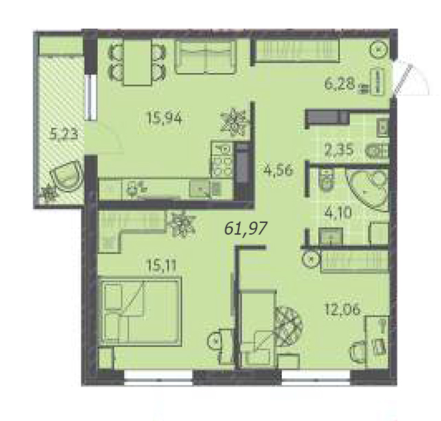 | 2 | 61.97 / 27.17 м² | от 7 436 400 руб. (120 000 руб./м²) | Планировка | |