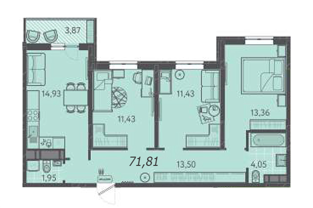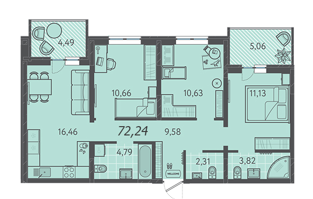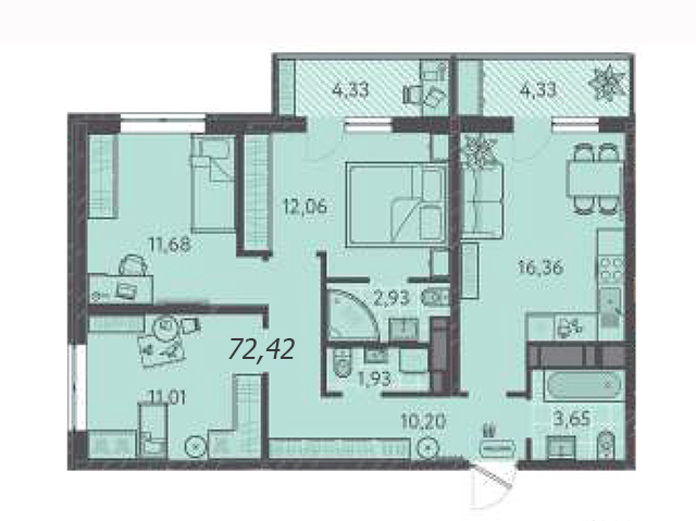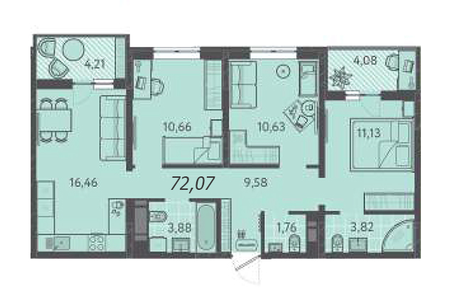 | 3 | 72.07 / 32.42 м² | от 8 648 400 руб. (120 000 руб./м²) | Планировка | |