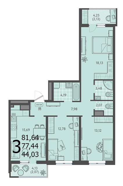 | 3 | 72.42 / 34.75 м² | от 8 690 400 руб. (120 000 руб./м²) | Планировка |