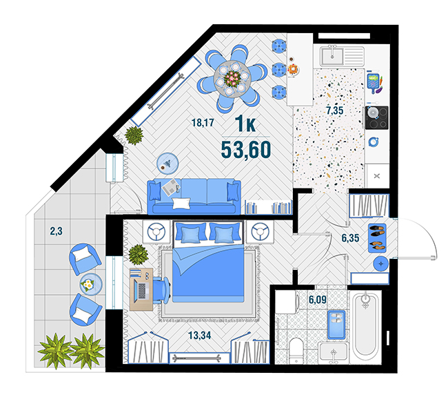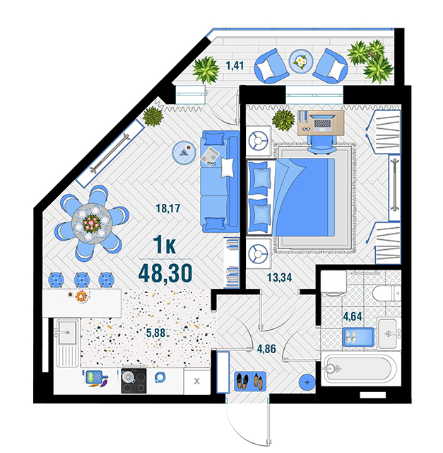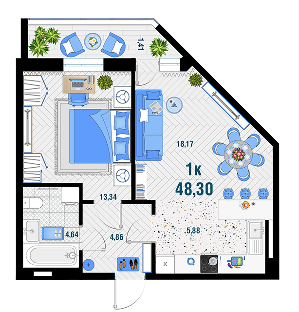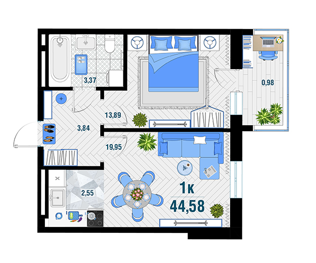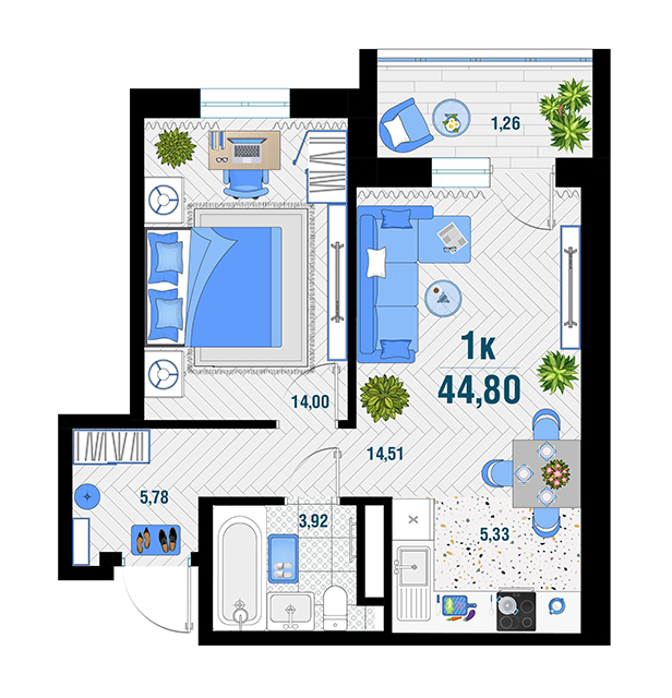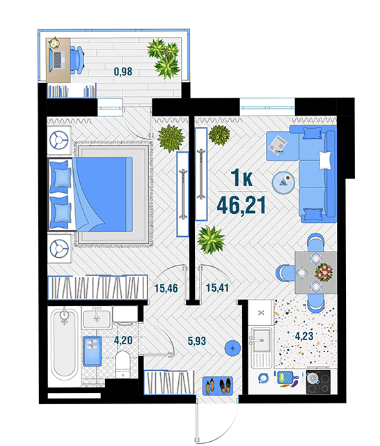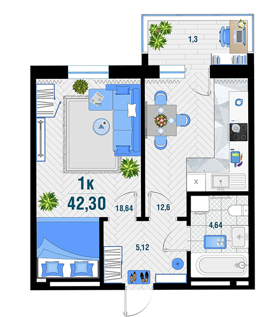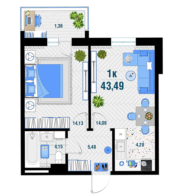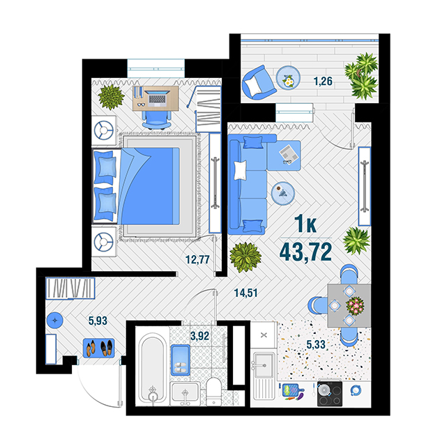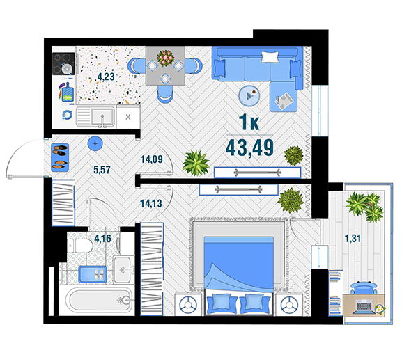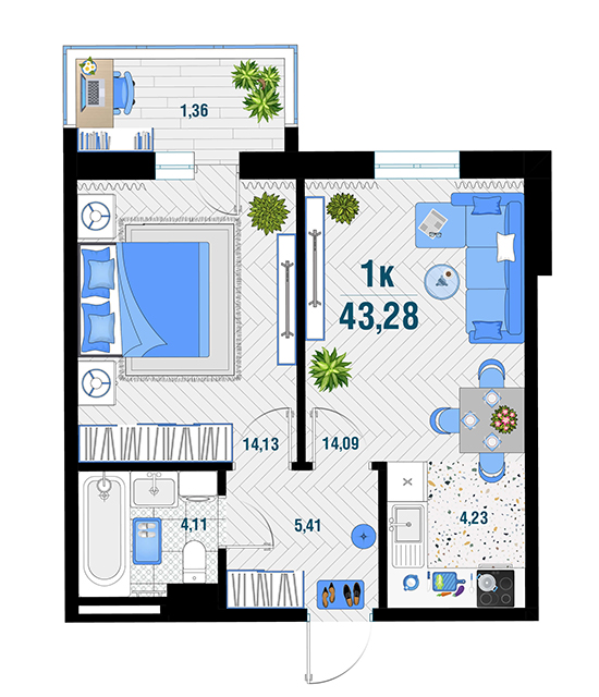 | 1 | 43.28 / 14.13 м² | от 5 994 280 руб. (138 500 руб./м²) | Планировка | |