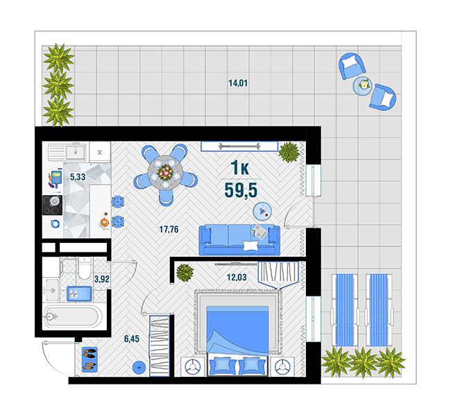 | 1 | 59.5 / 12.03 м² | от 7 687 400 руб. (129 200 руб./м²) | Планировка | |