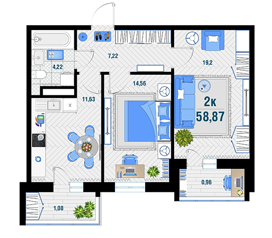 | 2 | 58.87 / 33.76 м² | от 7 653 100 руб. (130 000 руб./м²) | Планировка | |