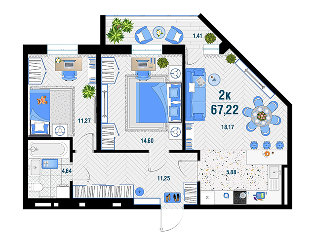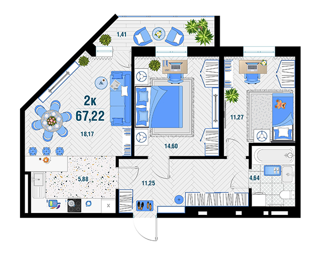 | 2 | 67.22 / 44.04 м² | от 8 738 600 руб. (130 000 руб./м²) | Планировка | |