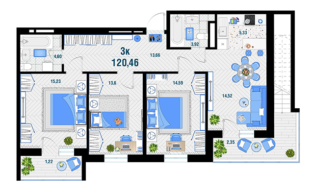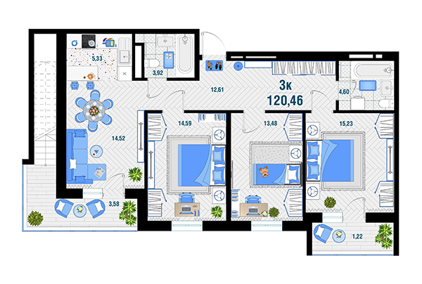 | 3 | 120.46 / 43.3 м² | от 15 683 892 руб. (130 200 руб./м²) | Планировка |
