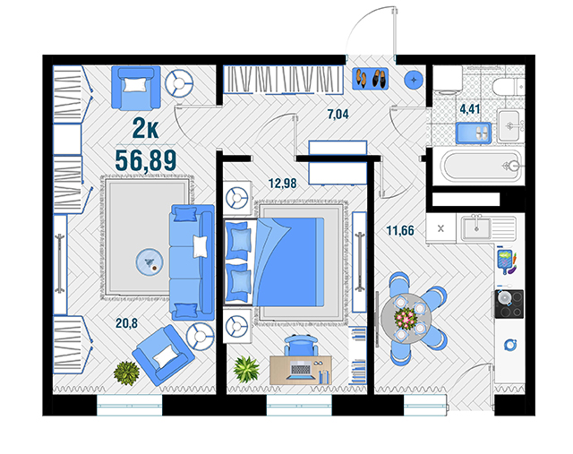 | 2 | 56.89 / 33.78 м² | от 7 225 030 руб. (127 000 руб./м²) | Планировка | |