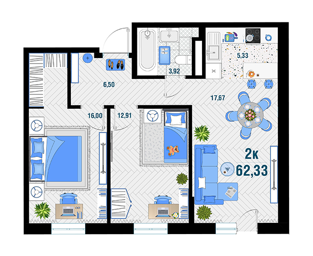 | 2 | 62.33 / 28.91 м² | от 7 915 910 руб. (127 000 руб./м²) | Планировка |