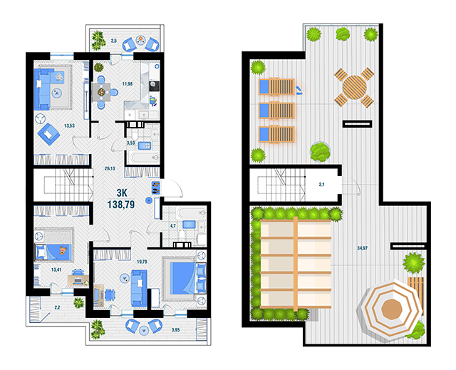 | 3 | 138.79 / 46.43 м² | от 18 764 408 руб. (135 200 руб./м²) | Планировка |