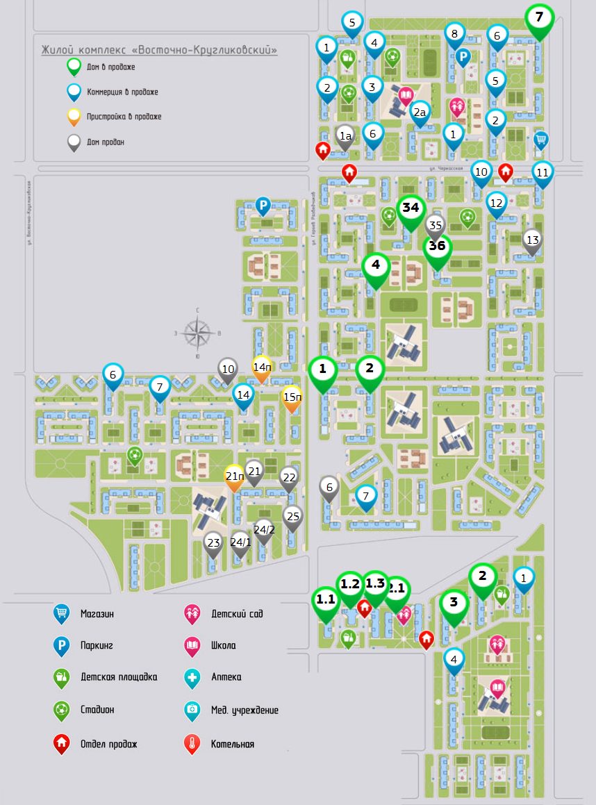 «Восточно-Кругликовский» – жилой комплекс класса "комфорт" в городе Краснодар – будет состоять из 20-ти литеров по 16 этажей каждый. Объект строится в районе ККБ, имеет стандартный архитектурный проект, однако некоторые из литеров украшены любопытными рисунками животных и дикой природы.