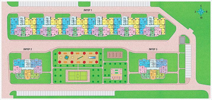 Во внутреннем дворе созданы зоны для активного отдыха, футбольное поле, баскетбольная площадка, уличные тренажеры, безопасные и современные детские площадки. Запланированы работы по созданию зеленых зон на территории ЖК. Возле комплекса предусмотрена наземная автостоянка, которая обеспечитвает жильцов и гостей надежным местом для автомобиля.