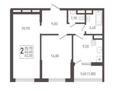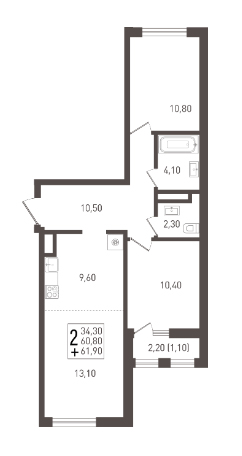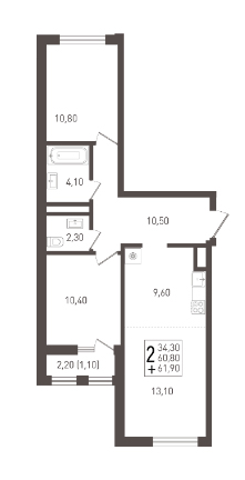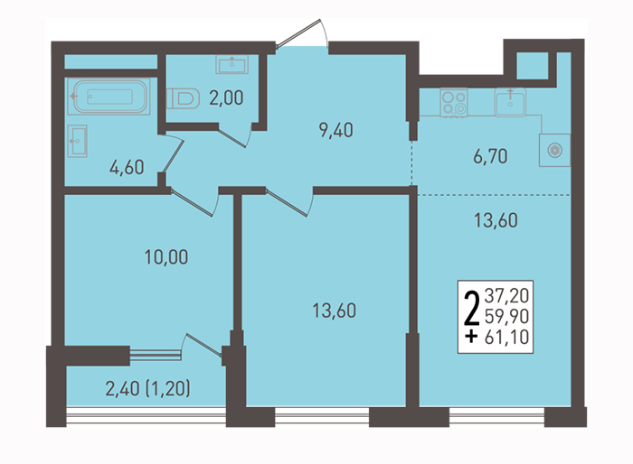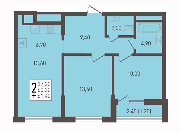 | 2 | 61.1 / 37.2 м² | от 7 784 140 руб. (127 400 руб./м²) | Планировка | |